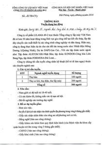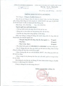 Thông báo tuyển lao động công ty cổ phần Lisemco 2