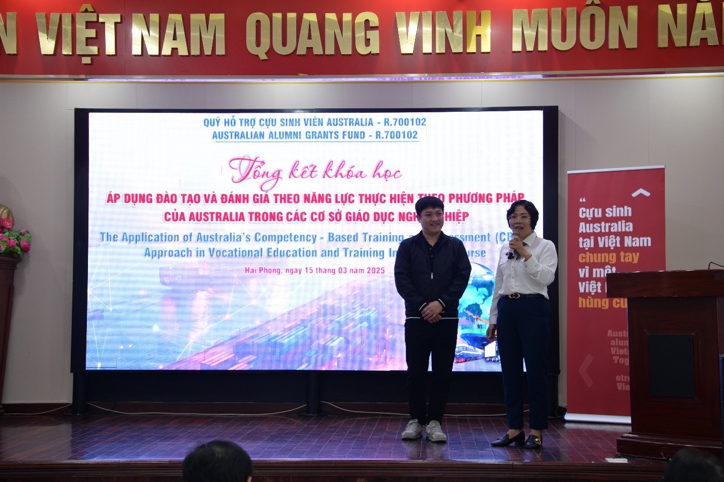 Tham dự Buổi tổng kết khoá học có bà Jennie Dehn – Giám đốc Chương trình Aus4skills (Australia); các chuyên gia giáo dục nghề nghiệp; đại diện Cục GDNN&GDTX, Cục Hàng hải và Đường thuỷ Việt Nam; đại diện cơ quan quản lý GDNN thuộc Sở Giáo dục đào tạo; Hội người khuyết tật; các doanh nghiệp Logistics, cảng tại thành phố Hải Phòng và lãnh đạo trường, trưởng phó các đơn vị và thầy cô giáo đến từ 07 trường thuộc khu vực phía Bắc tham gia trực tiếp và trực tuyến (Trường Cao đẳng Lào Cai; Trường Cao đẳng Kỹ thuật và Công nghệ tỉnh Hà Giang; Trường Cao đẳng Công nghiệp và Thương mại; Trường Cao đẳng Ngoại ngữ và Công nghệ Hà Nội; Trường Cao đẳng Công nghiệp Thực Phẩm; Trường Cao đẳng Giao thông vận tải Trung ương II và Trường Cao đẳng GTVT Đường thủy I).