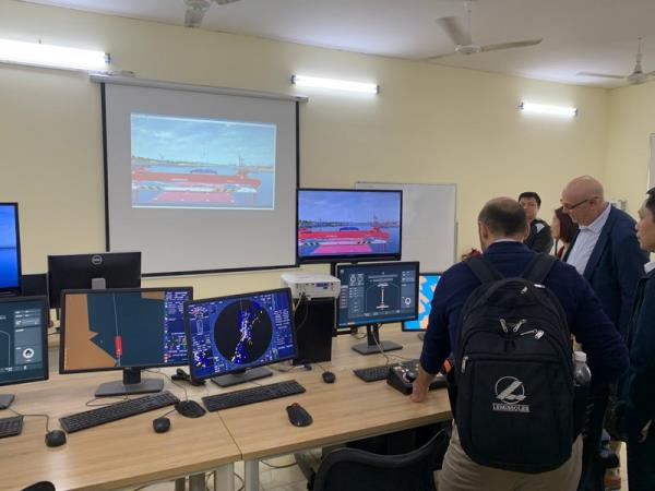 Ảnh 3. Đại diện chủ tàu Công ty Lemissoler tham quan cơ sở vật chất phục vụ công tác đào tạo và huấn luyện các ngành, nghề đi biển của nhà trường