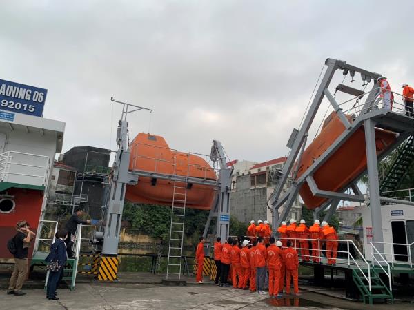 Ảnh 2. Đoàn chủ tàu Nhật Bản tham dự giờ học thực hành nâng, hạ xuồng cứu sinh của học viên các lớp sơ cấp