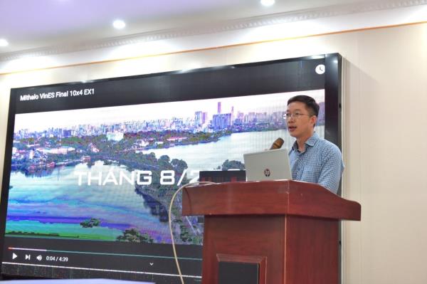 Đại diện Công ty VINES Ông Nguyễn Quốc Nguyên giới thiệu về công ty, điều kiện làm việc, cơ hội cũng như thách thức khi các bạn Sinh viên làm việc trong Nhà máy.