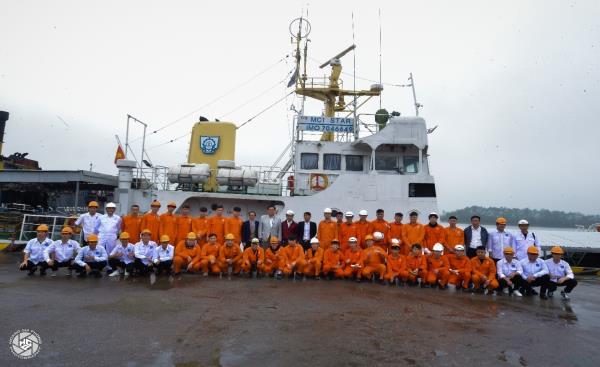 Ảnh 3, 4 . Ảnh lưu niệm giữa Ông Yoshida và sinh viên tại tàu Huấn luyện MC1 Star - Trường Cao đẳng Hàng hải I