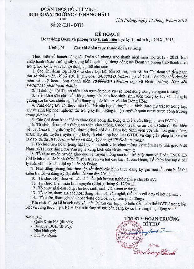 Kế hoạch hoạt động Đoàn và phong trào thanh niên học kỳ 1 năm học 2012-2013