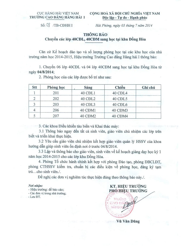 Thông báo: Chuyển các lớp 40 CĐL, 40 CĐM sang học tại khu Đồng Hòa