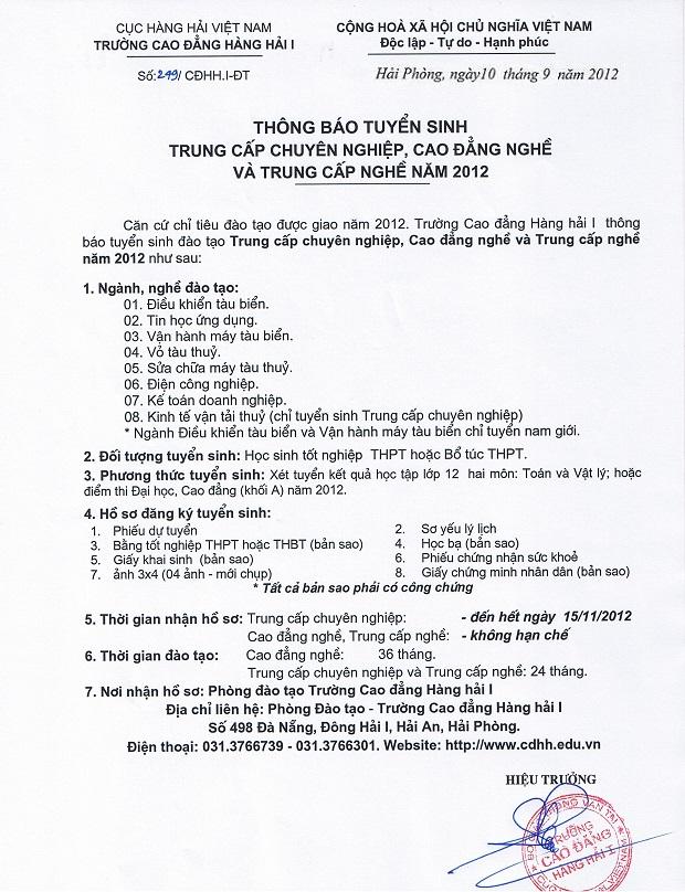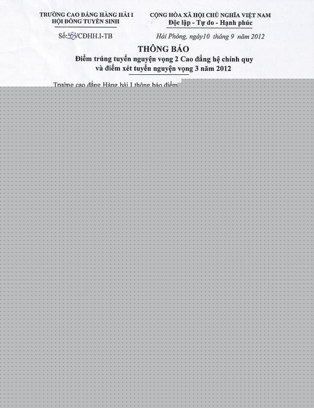 Thông báo: Điểm trúng tuyển NV2 Cao đẳng hệ chính quy, điểm xét tuyển NV3 và Tuyển sinh TCCN, CĐN, TCN năm 2012