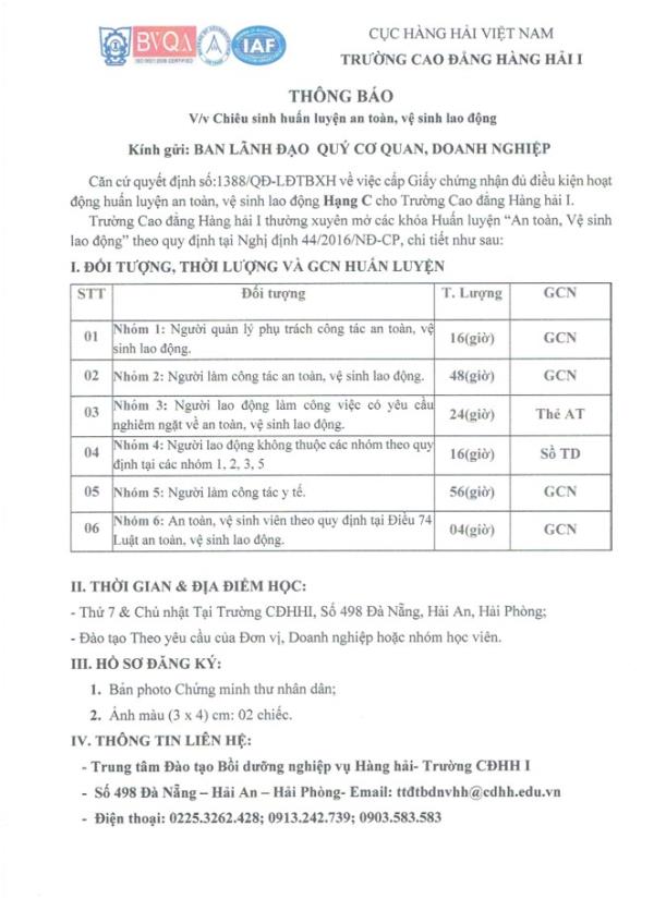 Thông báo: Tuyển sinh huấn luyến an toàn, vệ sinh lao động