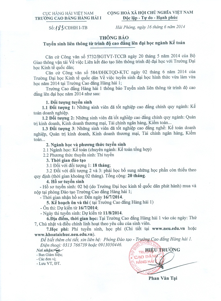 Thông báo: Tuyển sinh liên thông từ trình độ cao đẳng lên đại học ngành Kế toán