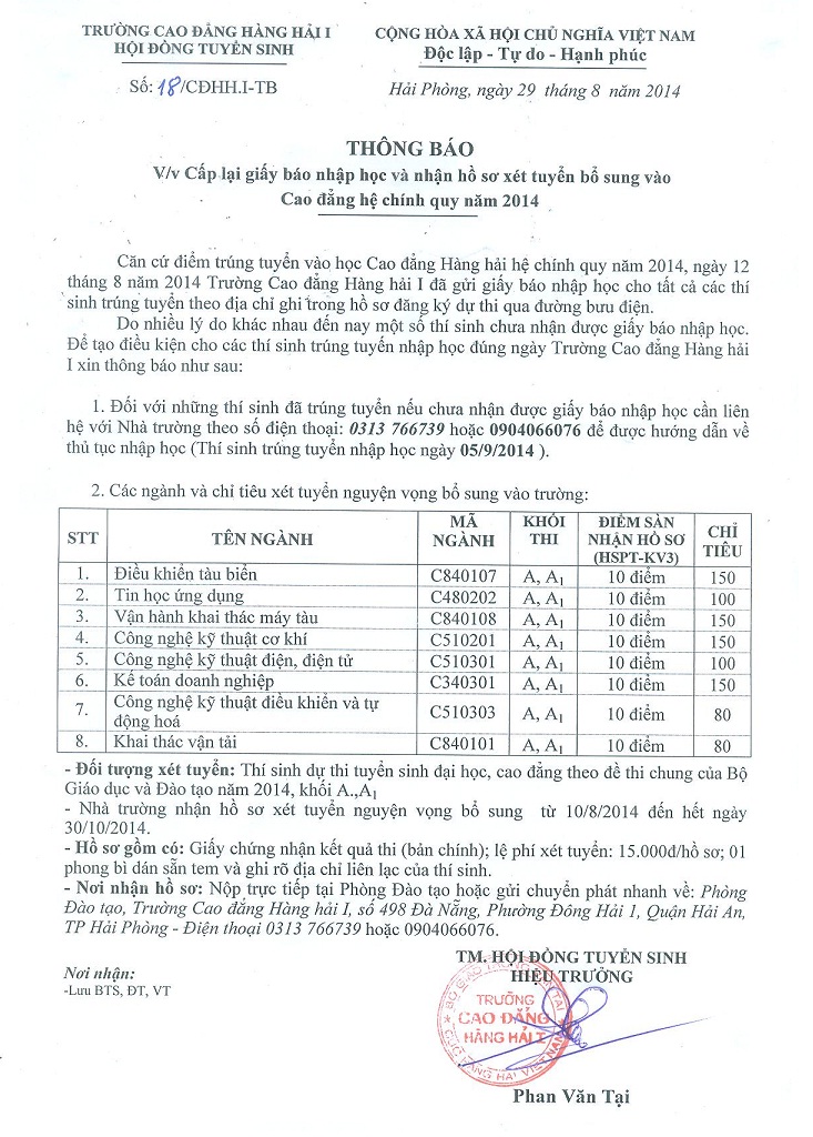 Thông báo: V/v Cấp lại giấy báo nhập học và nhận hồ sơ xét tuyển bổ sung vào CĐ hệ chính quy năm 2014