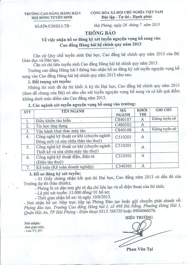 Thông báo: V/v nhận hồ sơ đăng ký xét tuyển nguyện vọng bổ sung vào CĐHHI hệ chính quy 2013