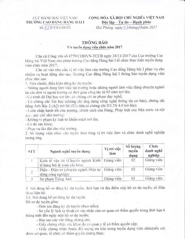 Thông báo: V/v tuyển dụng viên chức năm 2017