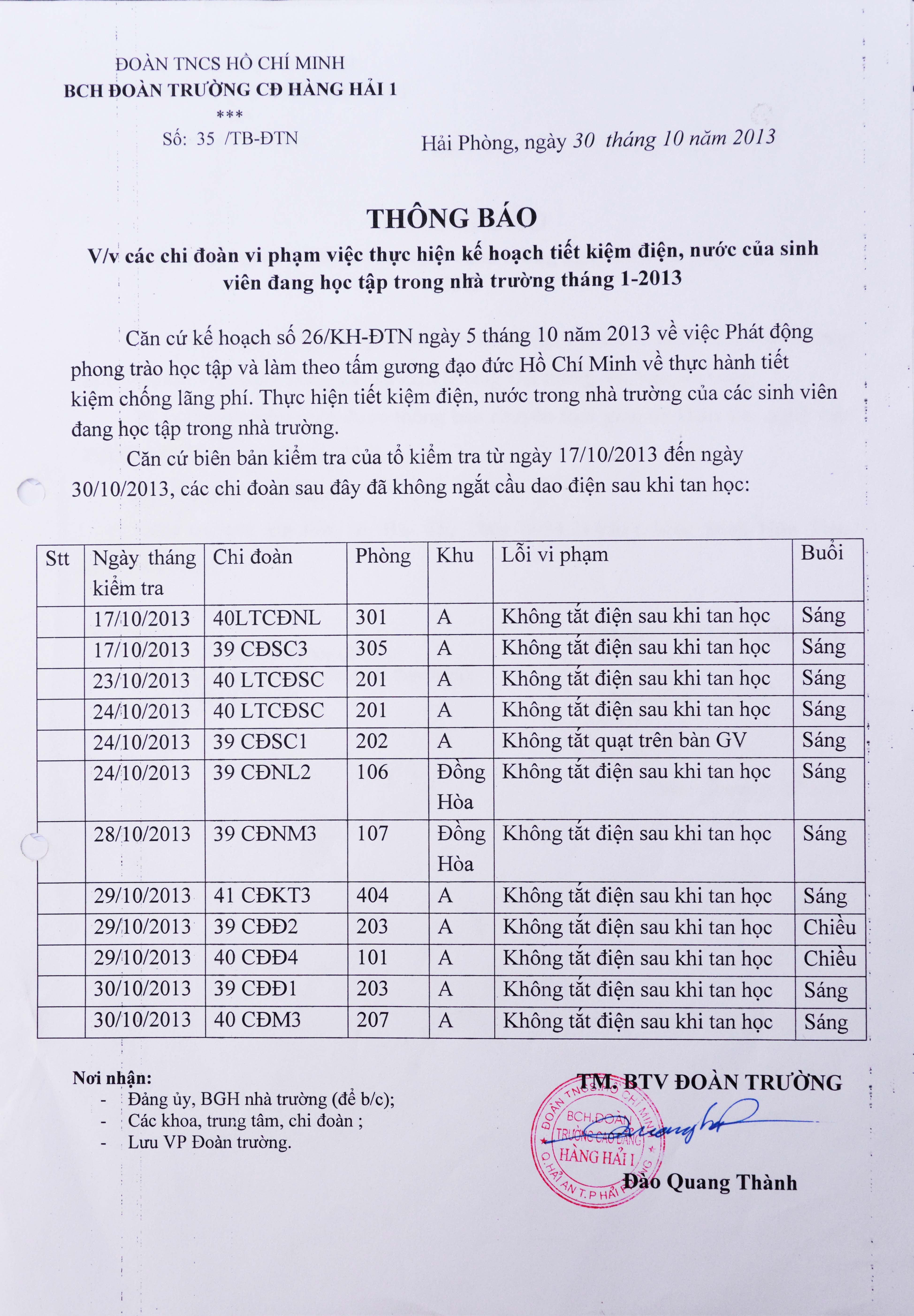 Thông báo các chi đoàn vi phạm thực hiện kế hoạch tiết kiệm điện, nước nơi giảng đường