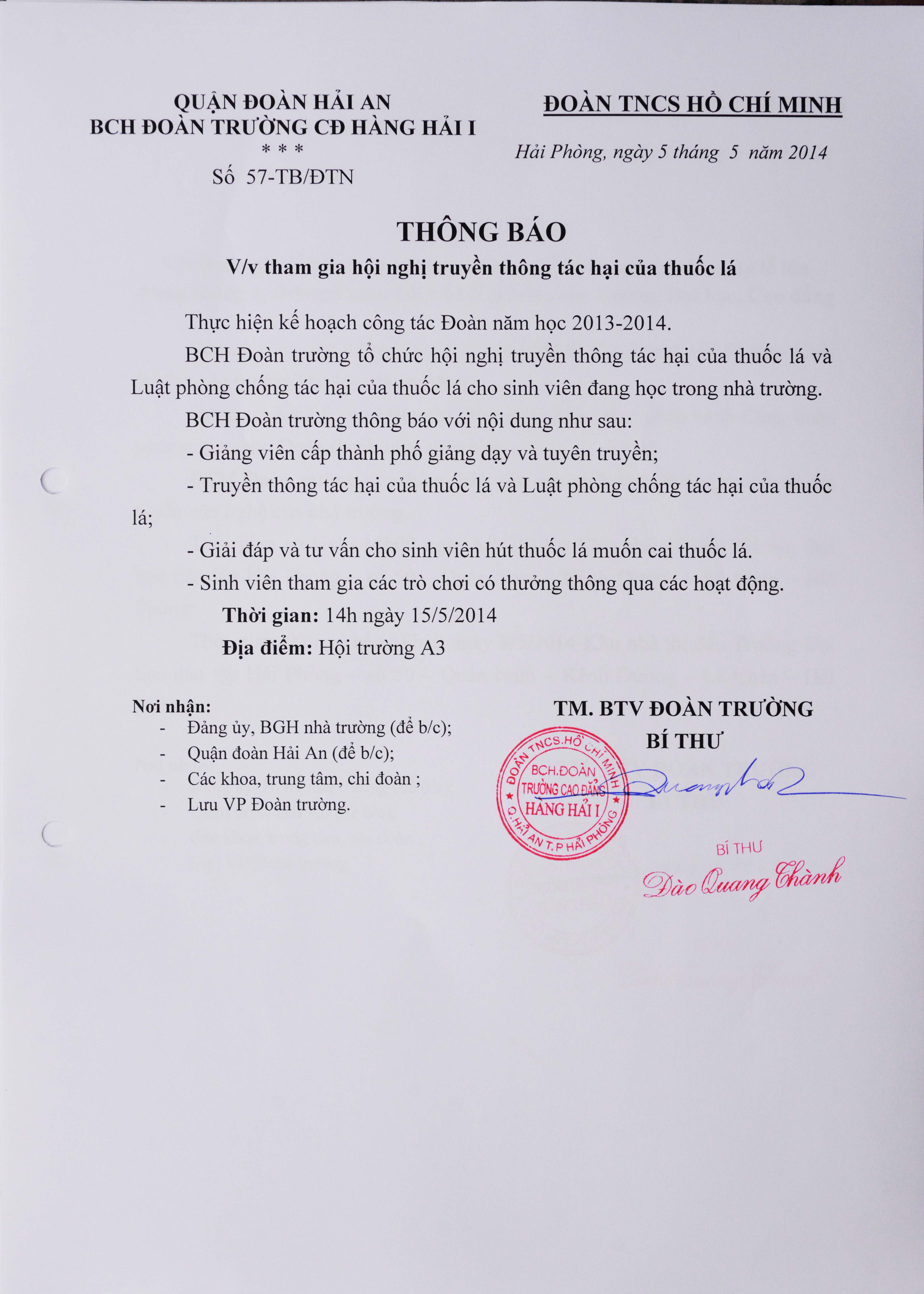 Thông báo tham gia cổ vũ cho đội văn nghệ nhà trường tham dự liên hoan Văn nghệ Công - Nông - Binh quận hải An 2014