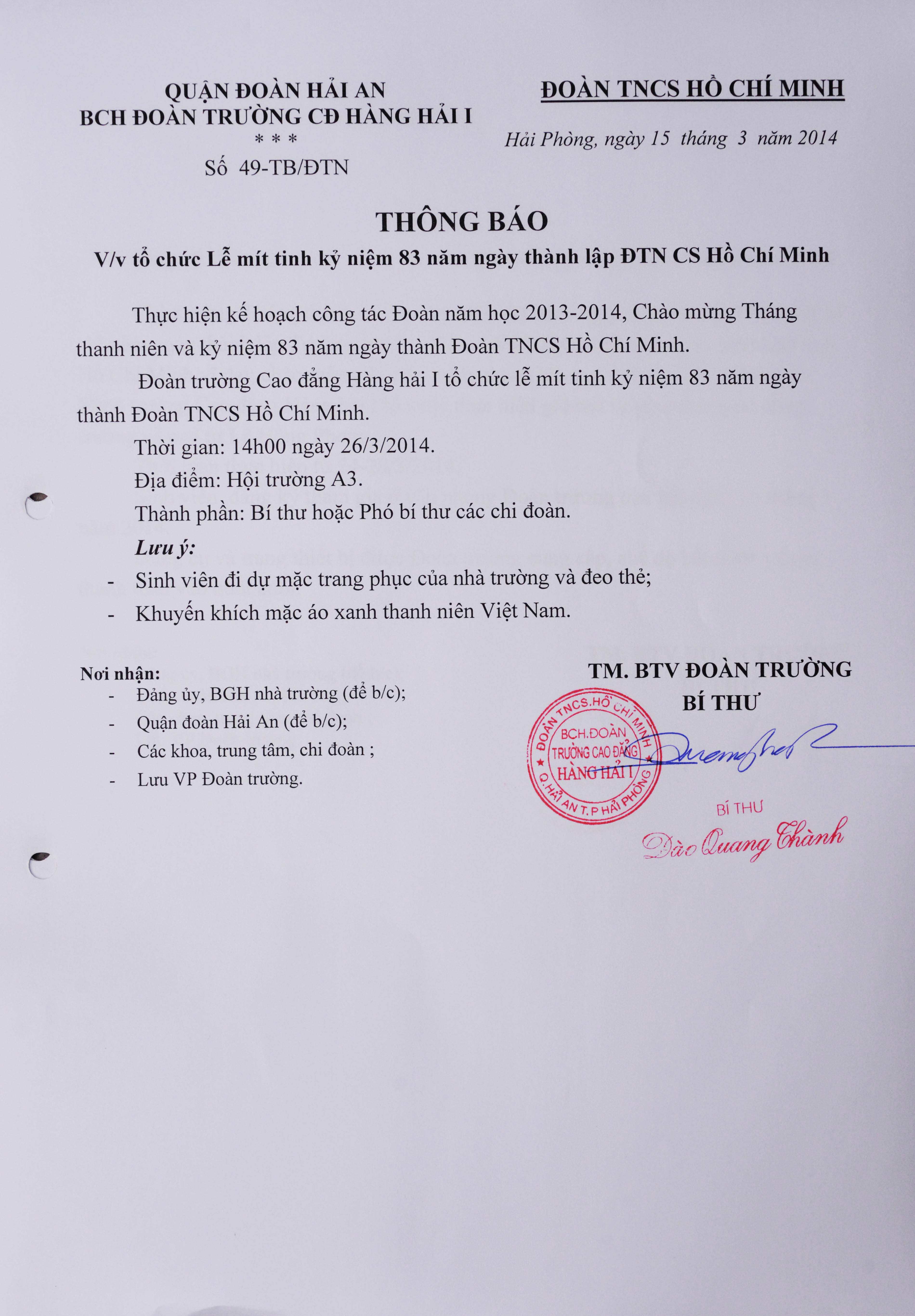 Thông báo tổ chức Lễ mít tinh kỷ niêm 83 năm ngày thành lập Đoàn TNCS Hồ Chí Minh