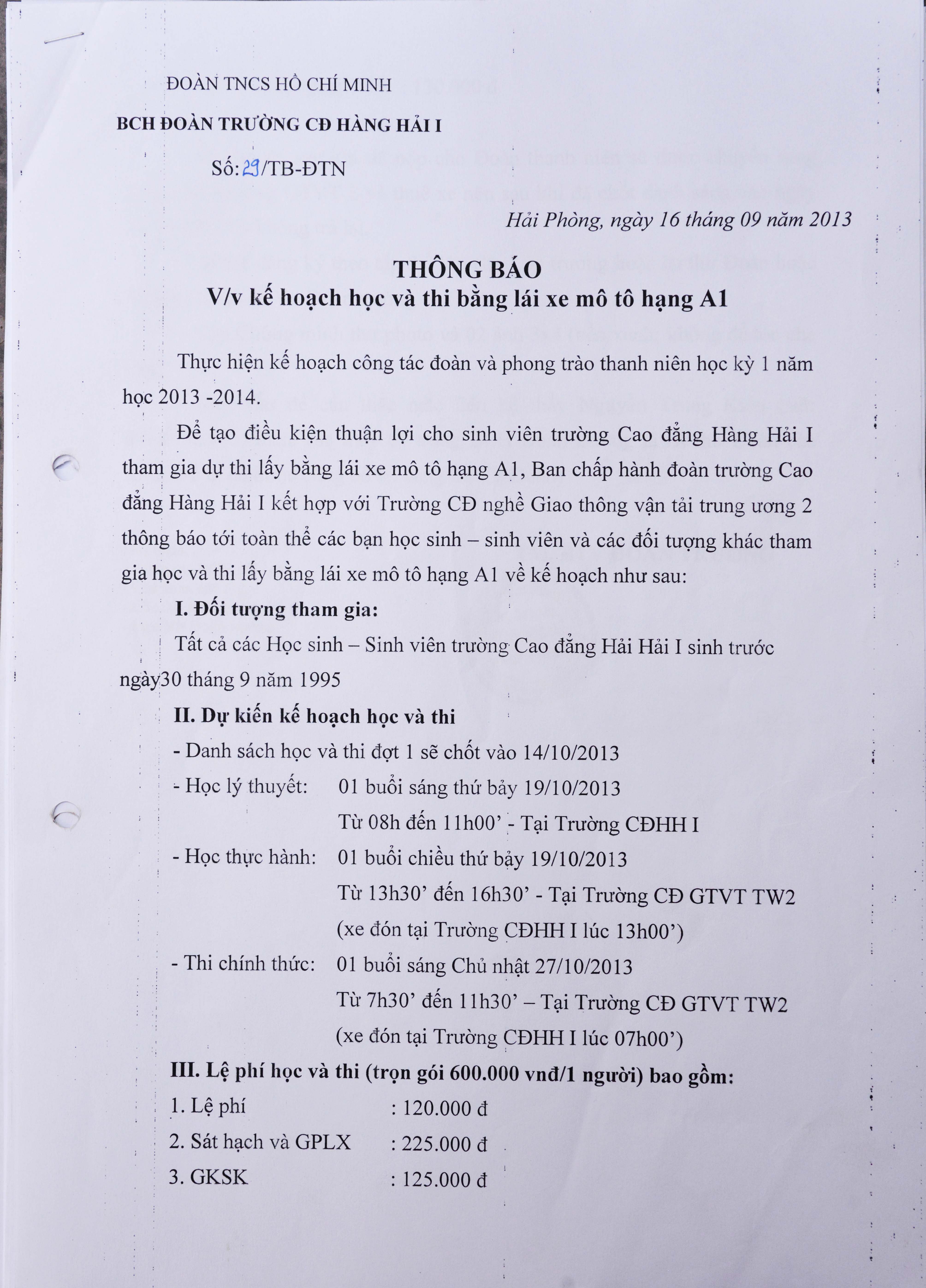 Thông báo tổ chức lớp học và thi lấy bằng lái xe mô tô hạng A1