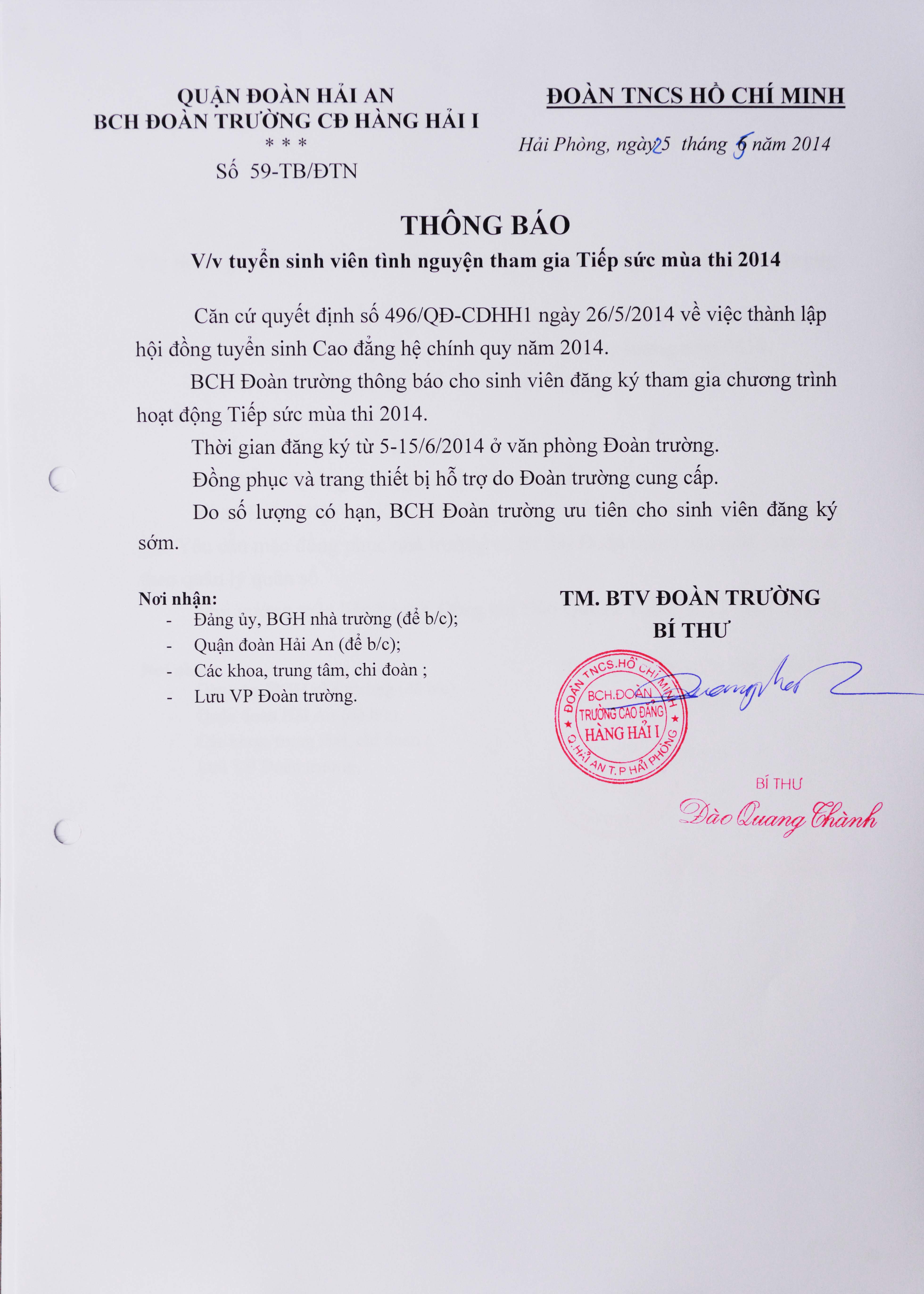 Thông báo đăng ký tham gia hoạt động an toàn giao thông tháng thanh niên 2014