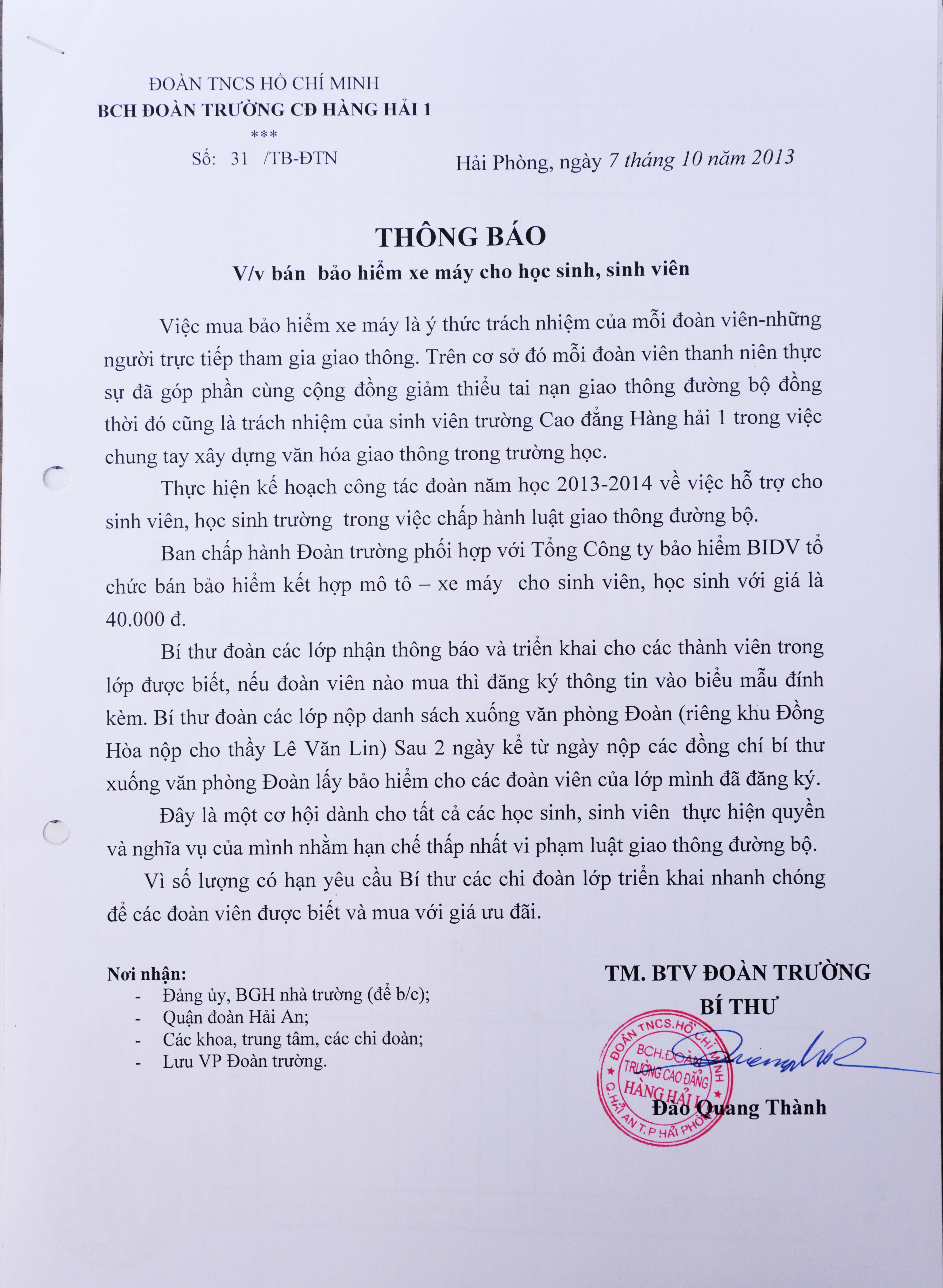 Thông báo về việc bán bảo hiểm mô tô cho sinh viên