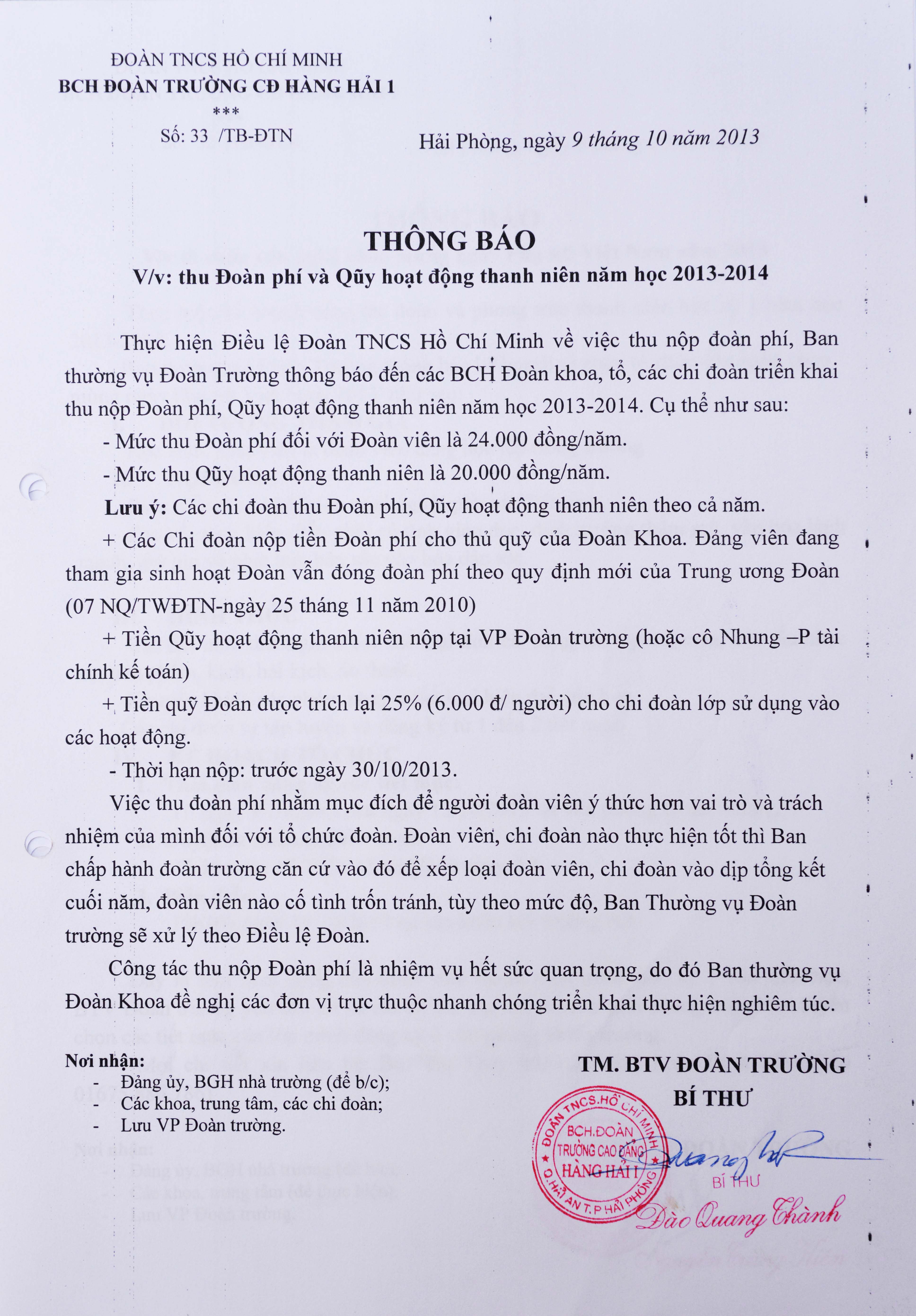 Thông báo về việc thu Đoàn phí và quỹ hoạt động thanh niên năm học 2013-2014