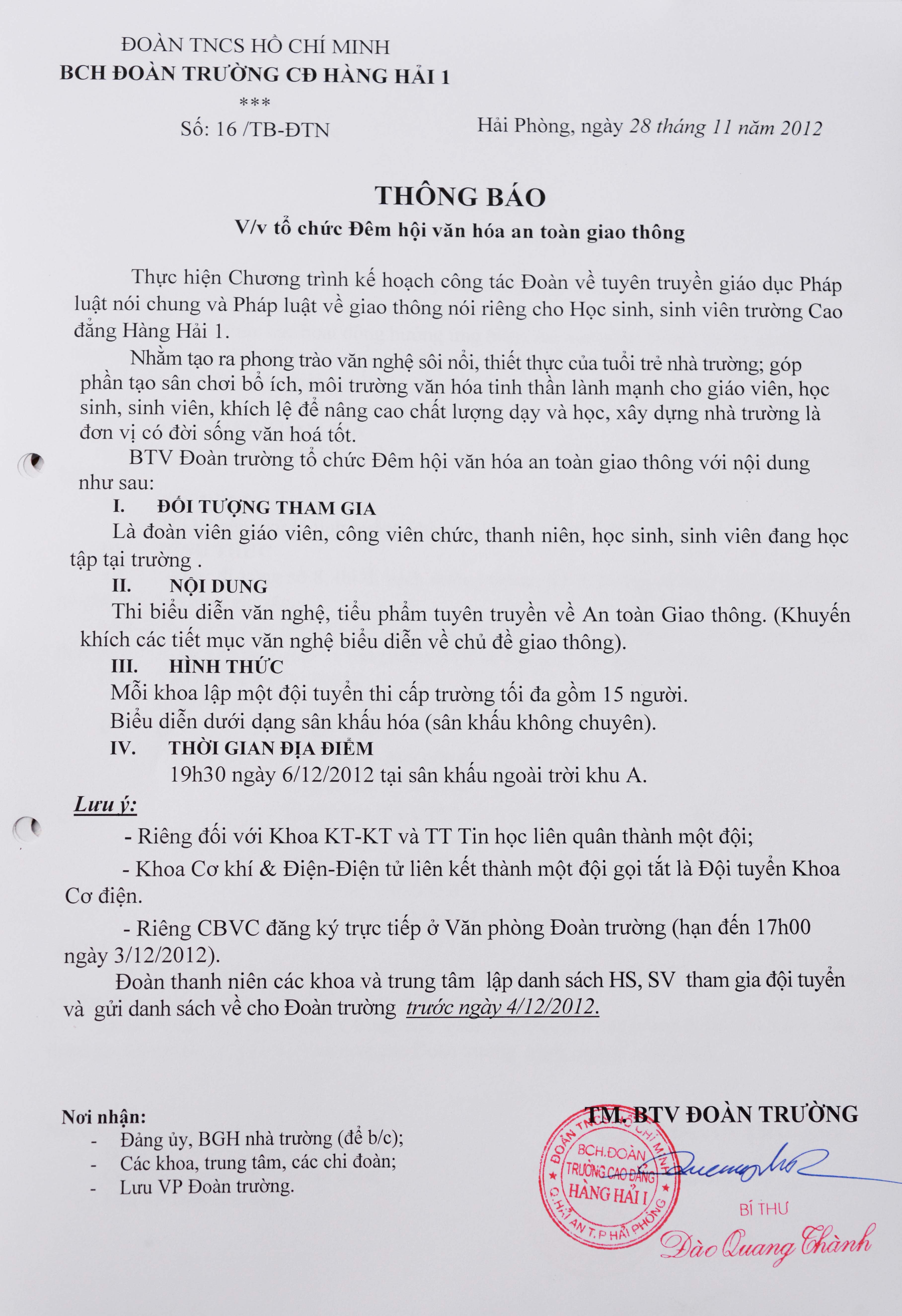 Thông báo về việc tổ chức Đêm hội văn hóa an toàn giao thông 2012