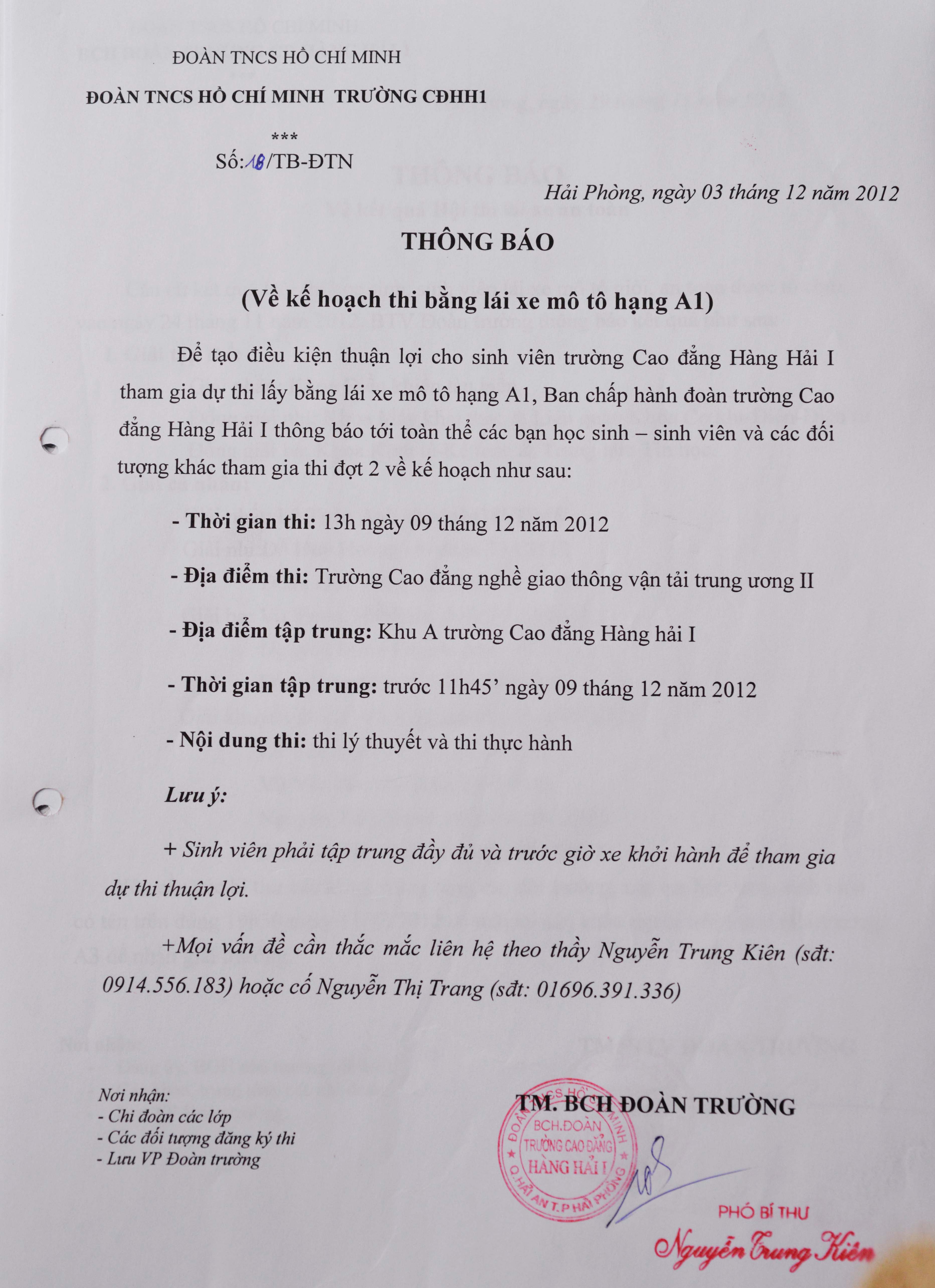 Thông báo về việc tổ chức thi lấy bằng lái xe mô tô A1
