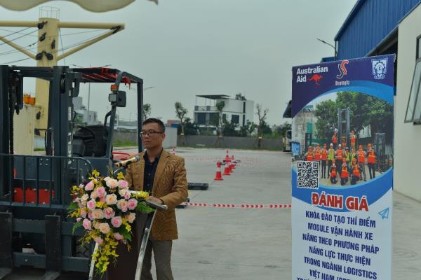 Phát biểu bế mạc, Tiến sỹ Lưu Việt Hùng hiệu trưởng Nhà trường cam kết sẽ khai thác hết nguồn lực của nhà trường để tổ chức thêm nhiều khoá đào tạo Vận hành xe nâng nói riêng và dịch vụ Logistics nói chung, chuyển giao giá trị nhận được từ Dự án đến nhiều đối tượng thụ hưởng trong xã hội