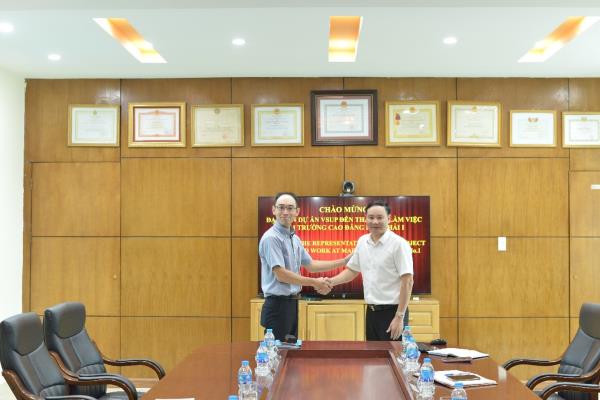 Ảnh 2. TS. Lưu Việt Hùng - Hiệu trưởng chào mừng nồng nhiệt Ông Ishino Junya - Trưởng đại diện văn phòng Dự án VSUP đã bố trí thời gian đến thăm trường