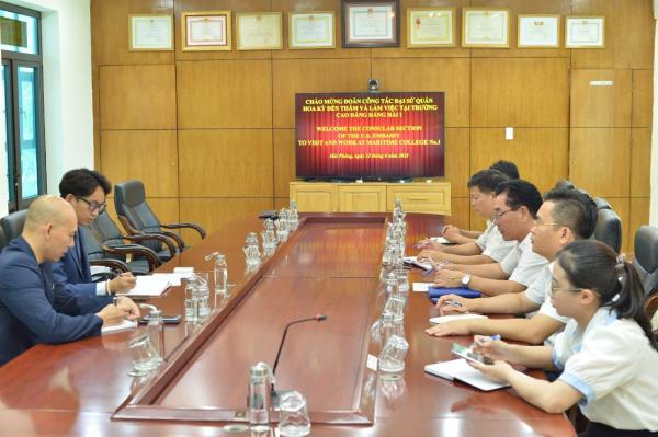 Tại buổi đón tiếp, Thầy Lương Quang Trung – Phó Hiệu trưởng nhà trường đã gửi lời chào mừng nồng nhiệt của Nhà trường đến đoàn công tác Lãnh sự Đại sứ quán Hoa Kỳ và chia sẻ thông tin về lịch sử hình thành, phát triển, cơ cấu tổ chức, quy mô tuyển sinh, công tác tuyển sinh, đào tạo, sự gắn kết giữa doanh nghiệp và nhà trường trong đào tạo, việc làm của sinh viên sau tốt nghiệp và công tác bồi dưỡng, huấn luyện thuyền viên… của trường.