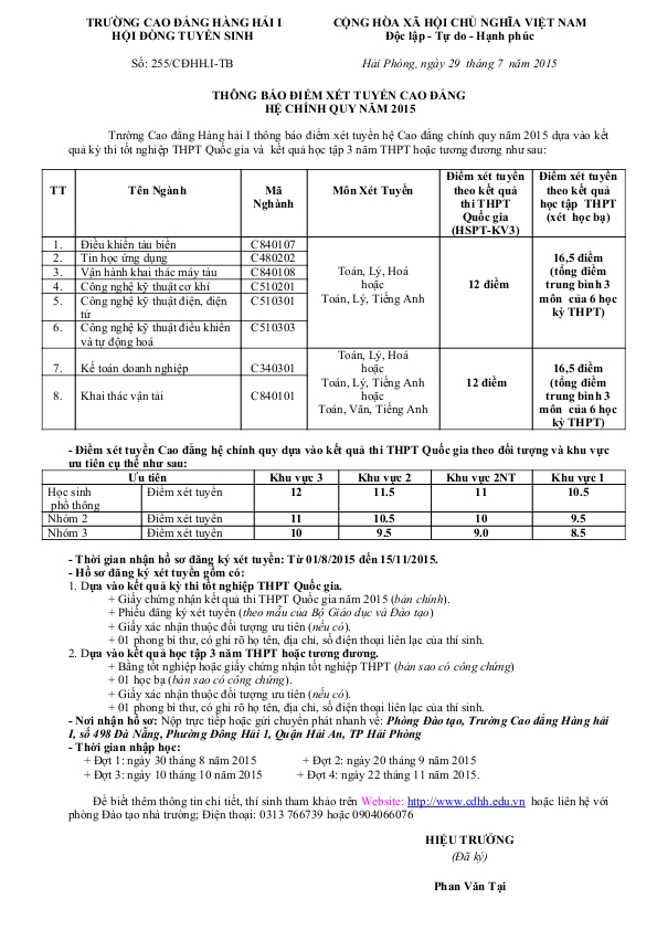 THÔNG BÁO ĐIỂM XÉT TUYỂN CAO ĐẲNG HỆ CHÍNH QUY NĂM 2015