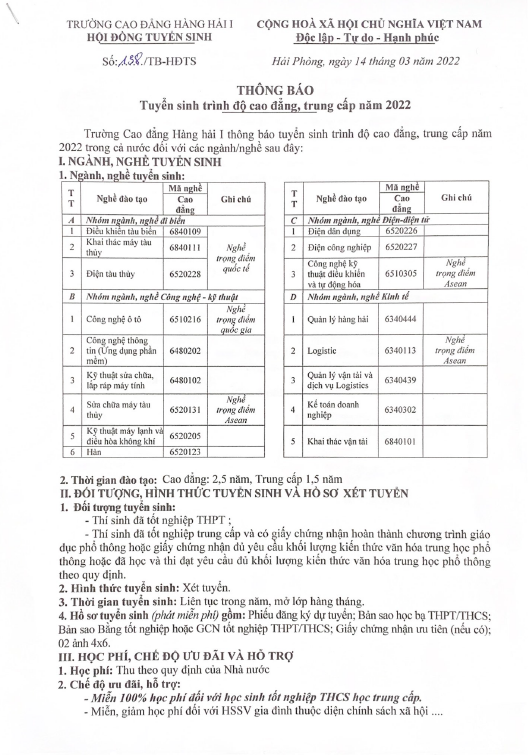Thông báo: Tuyến sinh hệ Trung cấp, Cao đẳng năm 2022