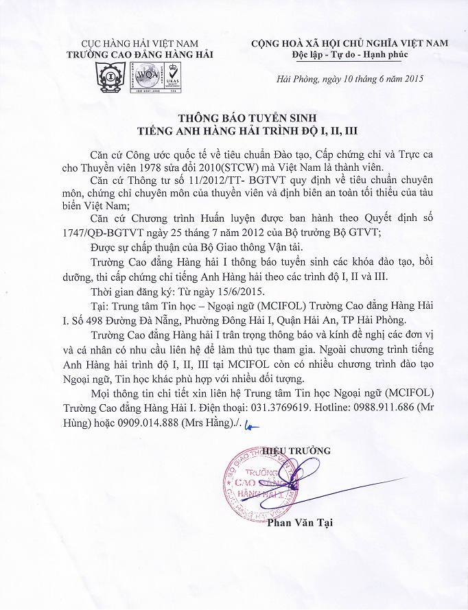 Thông báo: Tuyên sinh lớp tiếng Anh hàng hải I,II,III