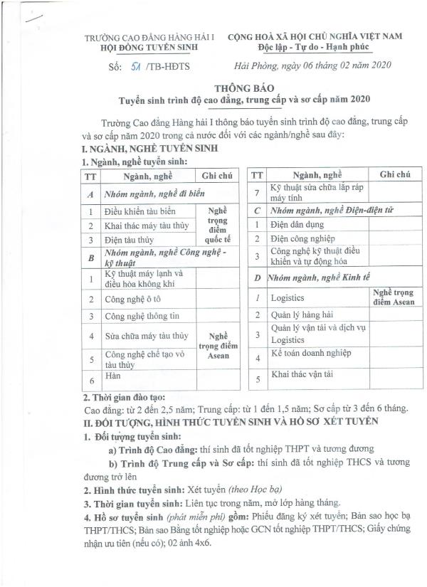 Thông báo: Tuyển sinh trình độ cao đẳng, trung cấp và sơ cấp 2019