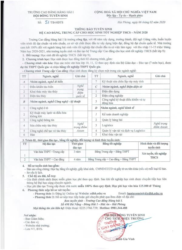 Thông báo: Tuyển sinh trình độ Cao đẳng, Trung cấp cho học sinh tốt nghiệp THCS năm 2020