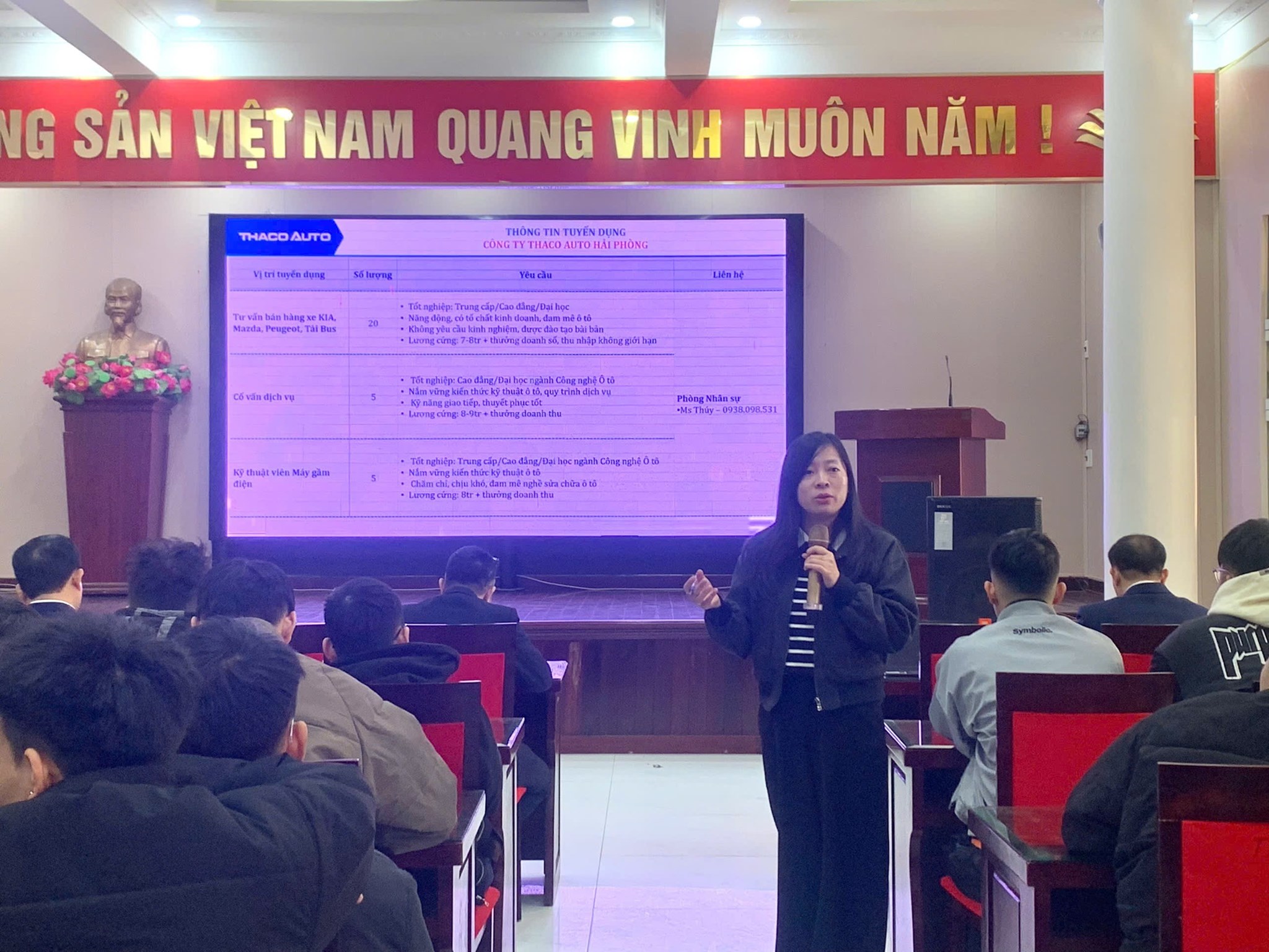 Tại buổi làm việc, đại diện Thaco Auto Hải Phòng đã giới thiệu tổng quan về tập đoàn, định hướng phát triển trong lĩnh vực sản xuất, lắp ráp, kinh doanh và dịch vụ ô tô, đồng thời chia sẻ nhu cầu nhân lực kỹ thuật trong giai đoạn hiện nay và những năm tới. Đặc biệt, doanh nghiệp nhấn mạnh vai trò của đội ngũ kỹ thuật viên ô tô có tay nghề vững, tác phong công nghiệp và khả năng thích ứng với công nghệ mới.