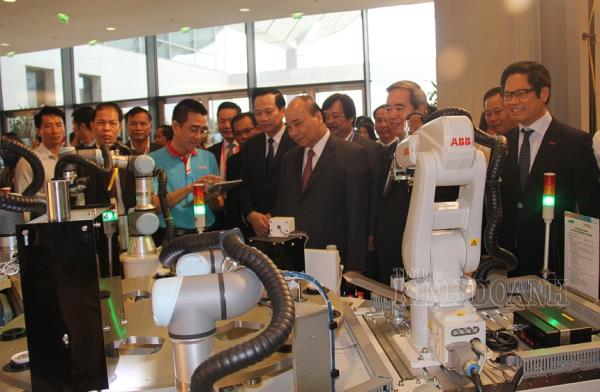 Thủ tướng Nguyễn Xuân Phúc và lãnh đạo Bộ Lao động thương Binh và Xã hội tham quan gian hàng triển lãm công nghệ giáo dục nghề nghiệp diễn ra cuối năm 2019.