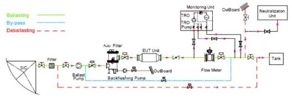 Nước biển từ hộp thông biển được bơm ballast hút và đẩy qua phin lọc tự động sau đó đi qua bộ EUT. Tại đây diễn ra qua trình điện phân và hình thành nên axit HClO để tiêu diệt các vi sinh vật có hại. Sau đó nước qua đồng hồ lưu lượng và vào két ballast. Bộ điều khiển sẽ căn cứ vào tín hiệu TRO mà điều khiển bộ EUT và bộ trung hòa.