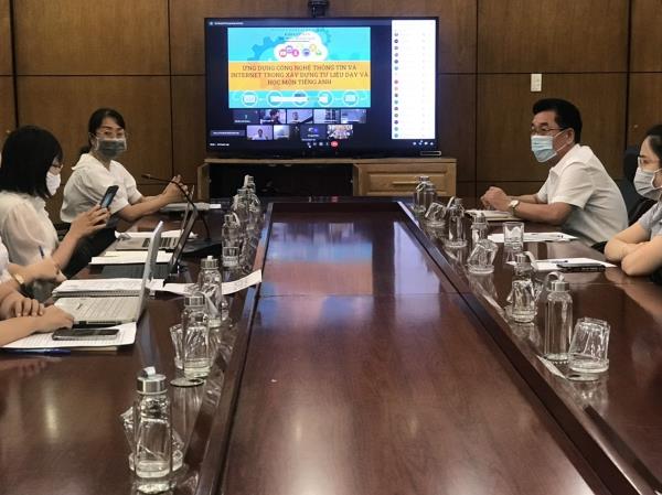 Báo cáo viên cũng nhấn mạnh vai trò của nhà trường trong việc thường xuyên quan tâm, nâng cấp hệ thống CNTT và kết nối Internet để hỗ trợ tối đa cho hoạt động dạy và học của nhà trường nói chung và môn tiếng Anh nói riêng. Cụ thể 100% các phòng học lý thuyết được trang bị máy chiếu, 03 phòng thực hành tiếng Anh có máy chiếu, hệ thống âm thanh và kết nối Internet. Đặc biệt vừa trải qua 2 mùa dịch Covid19, nhà trường đã nhanh chóng có các giải pháp duy trì việc dạy và học của thầy và trò bằng các ứng dụng CNTT, các phần mềm học trực tuyến ….