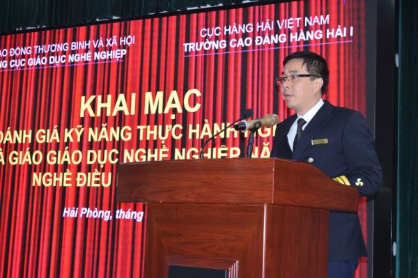 Phát biểu khai mạc, ThS. Đỗ Hồng Hải - Phó Hiệu trưởng bày tỏ niềm vinh dự khi Nhà trường được Tổng cục Giáo dục nghề nghiệp lựa chọn làm đơn vị tổ chức lớp bồi dưỡng, kiểm tra, đánh giá kỹ năng nghề cho Nhà giáo giáo dục nghề nghiệp nghề Điều khiển tàu biển năm 2020. Nhà trường đã tích cực chuẩn bị các điều kiện về cơ sở vật chất, thiết bị cần thiết nhằm phục vụ tốt nhất cho quá trình tổ chức bồi dưỡng, kiểm tra, đánh giá. Đồng chí cũng nhấn mạnh mục đích, ý nghĩa và tầm quan trọng của kỳ đánh giá kỹ năng nghề nhằm nâng cao trình độ tay nghề, phát triển nguồn nhân lực lao động kỹ thuật cao, tạo điều kiện cho mọi cá nhân có năng lực, kỹ năng nghề nghiệp được công nhận; đồng thời mong muốn các học viên bình tĩnh, tự tin, thực hiện tốt các phần thi và đạt được kết quả tốt nhất.