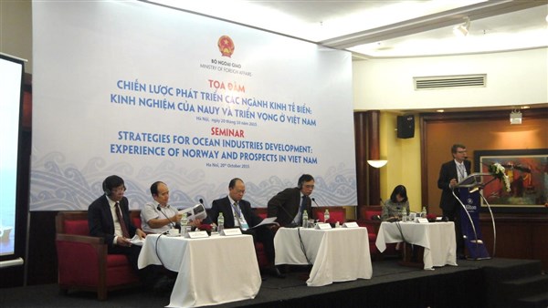 Sáng ngày 20/10/2015, tại Hà Nội, Bộ Ngoại giao Việt Nam phối hợp với Bộ Công thương và Thủy sản Na Uy tổ chức Tọa đàm “Chiến lược phát triển các ngành kinh tế biển: Kinh nghiệm của Na Uy và Triển vọng ở Việt Nam”. Thứ trưởng Bộ Ngoại giao Bùi Thanh Sơn và Quốc Vụ khanh Bộ Công thương và Thủy sản Na Uy Dilek Ayhan đã tham dự và phát biểu khai mạc Tọa đàm. Tham dự Tọa đàm có hơn 100 đại biểu đến từ các Bộ, ngành, viện nghiên cứu và doanh nghiệp Việt Nam trong các lĩnh vực thủy sản, hàng hải, đóng tàu...