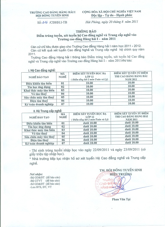 Trường Cao đẳng Hàng hải I thông báo điểm trúng tuyển, xét tuyển hệ Cao đẳng nghề và Trung cấp nghề vào trường CĐ Hàng Hải I - năm 2011 như sau: