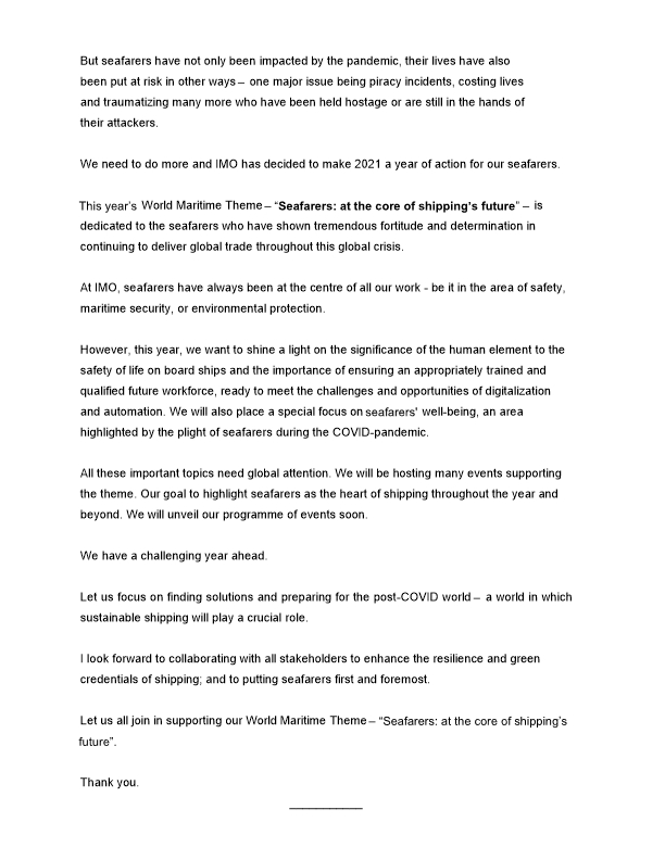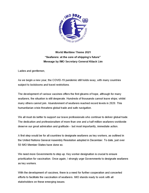 Thông điệp của Tổng thư ký IMO và chủ đề của ngày TV 2021: Seafarers: at the core of shipping's future.