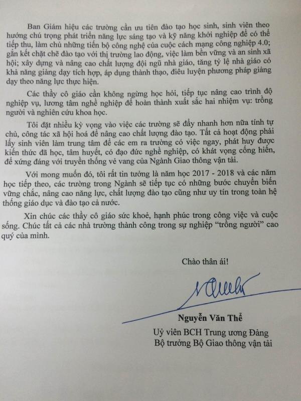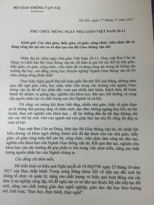 Thư chúc mừng ngày nhà giáo Việt Nam 20-11 của Bộ giao thông Vận tải