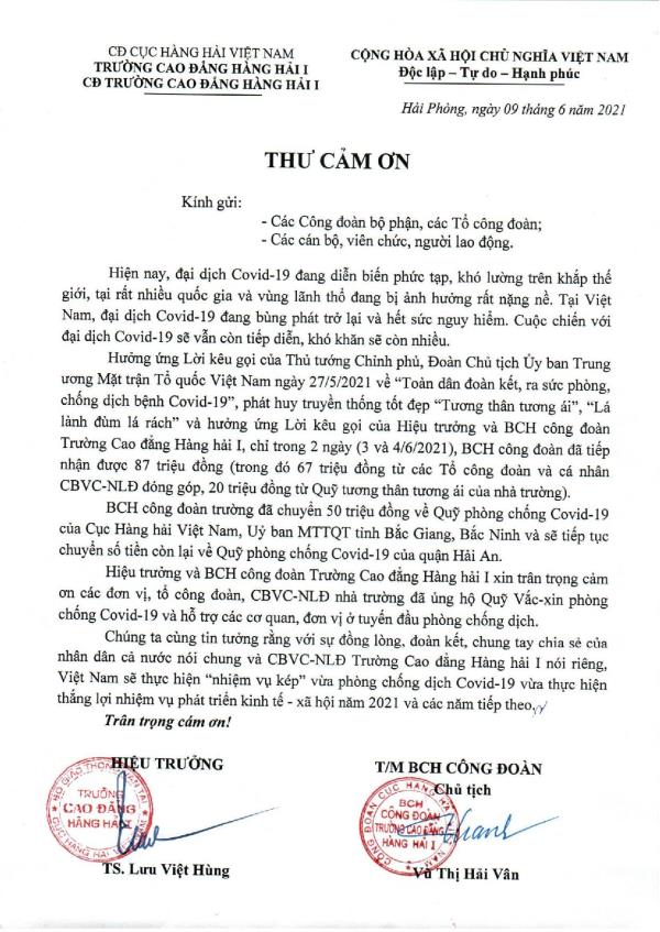 Trước những diễn biến phức tạp của dịch bệnh Covid-19, với quyết tâm “Chống dịch như chống giặc”, phát huy sức mạnh đoàn kết của các cấp, các ngành nhằm kiểm soát được dịch bệnh, đồng thời thực hiện nhiệm vụ phát triển kinh tế - xã hội, phát huy truyền thống tốt đẹp “Tương thân tương ái”, “Lá lành đùm lá rách”, Ban Giám hiệu và BCH công đoàn Trường Cao đẳng Hàng hải I kêu gọi các đơn vị, tổ công đoàn, các CBVC-NLĐ ủng hộ vào Quỹ Vắc-xin phòng, chống dịch Covid-19 và hỗ trợ các cơ quan, đơn vị ở tuyến đầu phòng chống dịch.