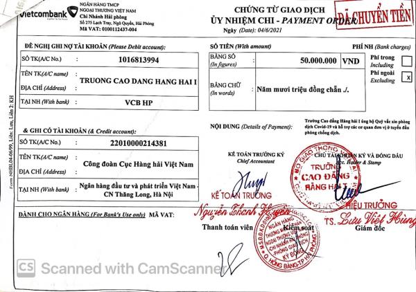 Chỉ sau 05 ngày (từ ngày 03/6/2021 đến ngày 08/3/2021) phát động Phong trào ủng hộ Quỹ Vaccine phòng, chống Covid-19 Việt Nam, tổng số tiền các đơn vị, cá nhân, các tổ công đoàn đã quyên góp được: 67.000.000 đồng. BCH công đoàn trường đã chuyển 50 triệu đồng về Quỹ phòng chống Covid-19 của Cục Hàng hải Việt Nam, Uỷ ban MTTQT tỉnh Bắc Giang, Bắc Ninh và tiếp tục chuyển số tiền còn lại về Quỹ phòng chống Covid-19 của quận Hải An.