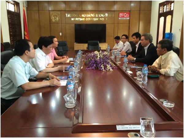 Tiếp đoàn có Phó Hiệu trưởng Đinh Gia Vinh và đại diện một số đơn vị có liên quan trong nhà trường. Phát biểu khai mạc, đồng chí Phó Hiệu trưởng đã nhiệt liệt chào đón đoàn đến thăm và làm việc với nhà trường, đồng thời giới thiệu với đoàn về các ngành, nghề nhà trường đang đào tạo như: Điều khiển tàu biển, Khai thác máy tàu biển, Điện tàu thuỷ, Công nghệ đóng tàu v.v…, đồng thời nhấn mạnh về các hoạt động huấn luyện cấp chứng chỉ chuyên môn nghiệp vụ, công tác đào tạo và huấn luyện sỹ quan Hàng hải các cấp độ cũng như khả năng cung cấp nguồn nhân lực Hàng hải có chất lượng cao, đáp ứng được yêu cầu chuyên môn của các chủ tàu quốc tế đặc biệt là các chủ tàu Nhật Bản.