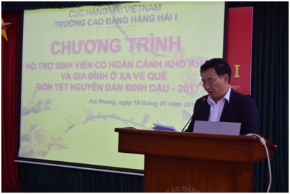 Chiều ngày 18/01/2017, tại Hội trường A3,Trường Cao đẳng Hàng hải I đã long trọng tổ chức Chương trình Hỗ trợ kinh phí cho học sinh sinh viên (HSSV) có hoàn cảnh khó khăn và HSSV ở xa trường về quê đón Tết Đinh Dậu 2017. Đây là năm thứ 3 Nhà trường triển khai hoạt động hỗ trợ cho các học sinh, sinh viên có hoàn cảnh khó khăn, ở xa trường về quê đón Tết.