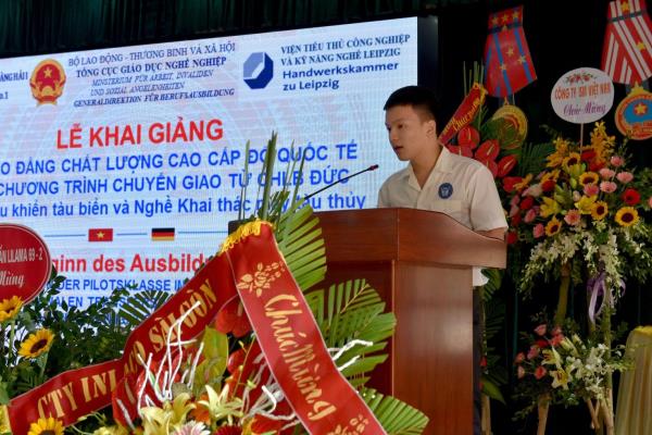 Phát biểu khai mạc buổi lễ, đồng chí Đinh Gia Vinh – Bí thư đảng ủy, Hiệu trưởng nhà trường, thay mặt tập thể cán bộ, giáo viên, viên chức, người lao động và học sinh, sinh viên toàn trường cảm ơn lãnh đạo Cục Hàng hải Việt Nam, Sở Lao động – Thương binh và Xã hội thành phố Hải Phòng, các doanh nghiệp trong và ngoài ngành Hàng hải... đã có những lẵng hoa tươi thắm chia vui, chúc mừng thầy trò nhà trường nhân Lễ khai giảng 02 lớp Điều khiển tàu biển và Khai thác máy tàu thủy đào tạo theo chương trình chuyển giao từ CHLB Đức. Đây là chương trình được đào tạo theo chuẩn quốc tế, sau tốt nghiệp, sinh viên được cấp 2 bằng: 01 bằng tốt nghiệp do Trường Cao đẳng Hàng hải I cấp và 01 bằng tốt nghiệp của Đức (theo tiêu chuẩn CHLB Đức).