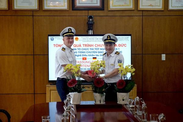 Đại diện phía chuyên gia, Ông Thilo Fritz gửi lời cảm ơn nhà trường đã nhiệt tình phối hợp, nỗ lực vượt khó để thực hiện tốt các hướng dẫn, yêu cầu của chuyên gia về công tác tổ chức đào tạo nghề Điều khiển tàu biển theo tiêu chuẩn Đức; đánh giá nhà trường đã hoàn thành tốt công tác chuẩn bị, cả 16 sinh viên nghề Điều khiển tàu biển đã có đủ điều kiện tham gia kỳ thi tốt nghiệp phần 1. Chuyên gia nhận thấy nhà trường có đội ngũ giảng viên chất lượng, tận tâm, có kỹ năng nghề cao; các sinh viên có tinh thần, thái độ học tập hăng say, nhiệt huyết, thậm chí còn hơn nhiều sinh viên nghề Điều khiển tàu biển đang học tập tại Đức. Ông cũng tin tưởng rằng các sinh viên sẽ đạt kết quả cao trong kỳ thi tốt nghiệp phần 1 sắp tới.
